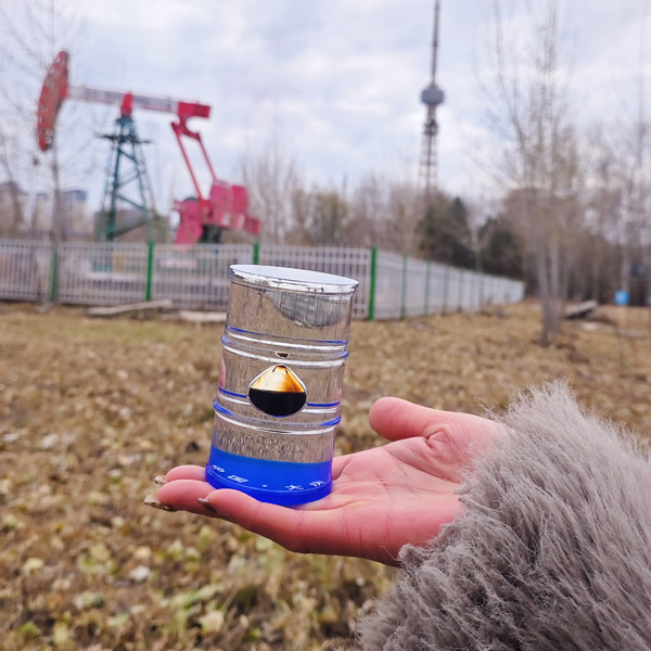 【简介】这款一滴油以油桶为设计原型。油桶的造型被高度还原,桶身的纹理体现出工业设计的精巧。油桶是石油运输与储存的经典容器,它承载着大庆油田石油开采、运输的历史记忆,见证了石油从油田走向世界的漫长旅程。而那一滴原油,则是整个设计的点睛之笔,黑亮而富有光泽,仿佛蕴含着无穷的能量。两者相结合,使这款纪念品具有了深刻的意义,无论是作为纪念品摆放在案头,还是作为礼物送给他人,它都能让人们深切感受到大庆的辉煌与石油的珍贵。