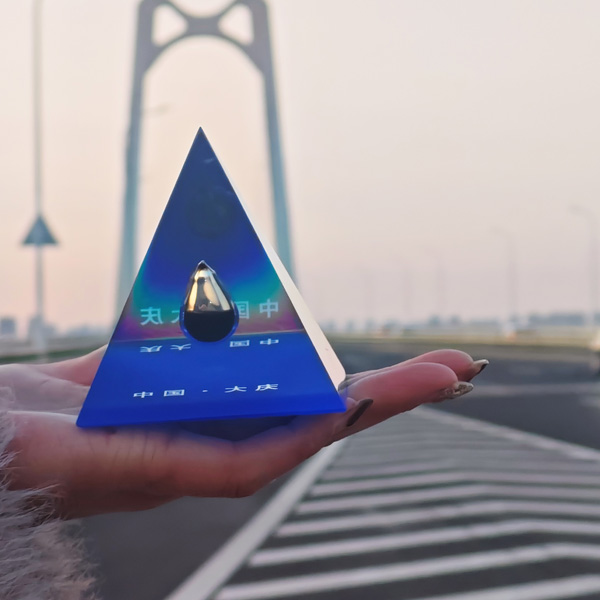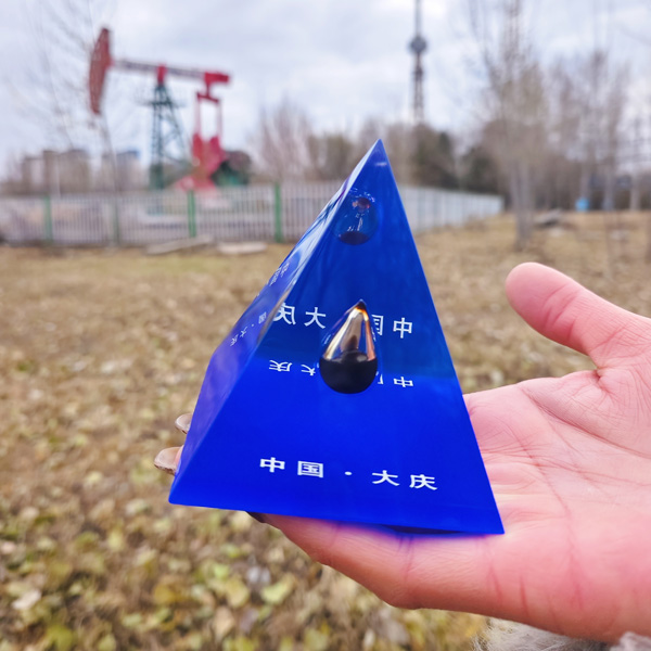 【简介】这款一滴油以金字塔为设计基底,承载着古老文明的智慧底蕴,同时也为整个作品奠定了沉稳的基调。而那一滴原油,呈现出独特的色泽,在光线下微微闪耀着温润的光芒,仿佛汇聚了大庆石油所蕴含的巨大能量。金字塔的基底赋予了原油新的意义,将古老的象征与现代工业的核心元素相结合。它不仅仅是一件工艺品,更像是一座连接过去与现在的桥梁,它提醒着人们大庆石油工业的发展历程,以及石油在推动经济与社会进步中所起到的关键作用,是兼具艺术价值与历史意义的独特纪念品。