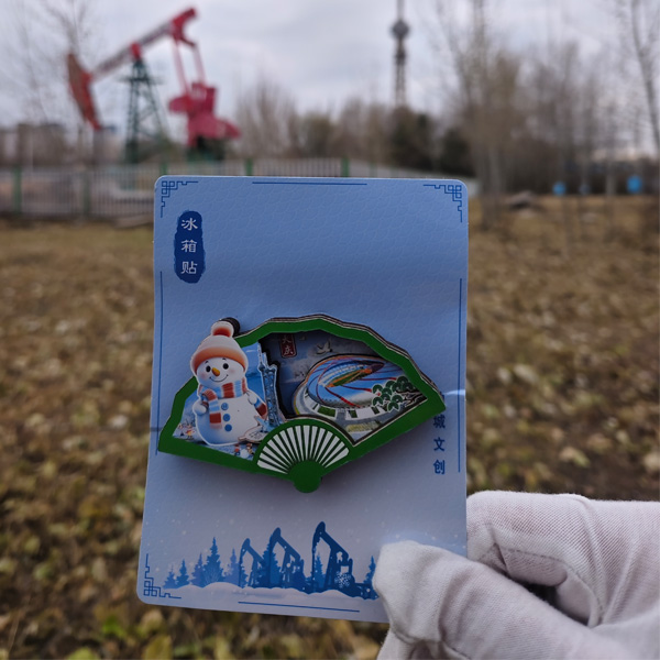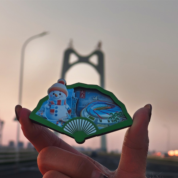 【简介】这款别具一格的扇形冰箱贴,生动地展现了大庆的独特风情。东北雪人的元素为冰箱贴增添了浓郁的地域特色和冬日的欢乐氛围,那圆圆的脑袋、胡萝卜鼻子,带着东北冬天的寒冷气息与童真的欢乐,让人一看就心生暖意;大庆鸟巢体育馆的元素则展现了大庆的现代建筑之美,它是体育精神在大庆的象征,承载着无数运动健儿的汗水与荣耀;湿地观光塔高高耸立,它代表着大庆丰富的生态资源和美丽的自然风光,从塔上远眺的美景仿佛透过冰箱贴呈现在眼前,那是湿地的广袤、生态的和谐。