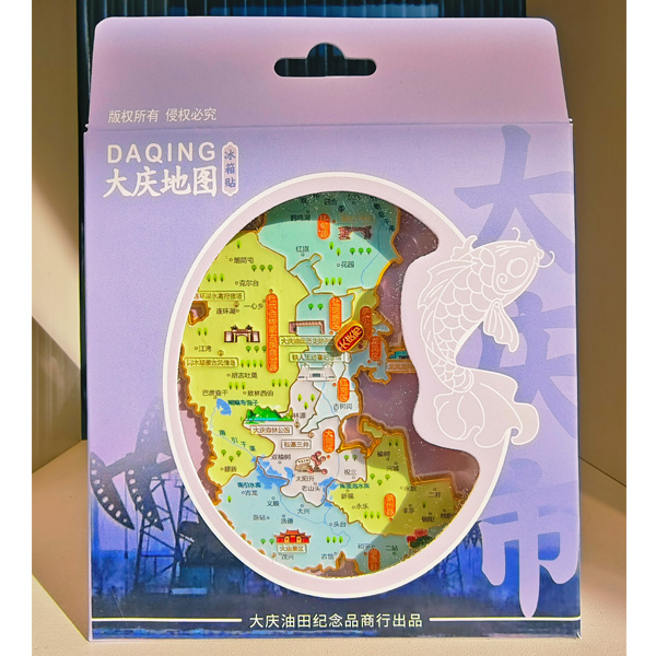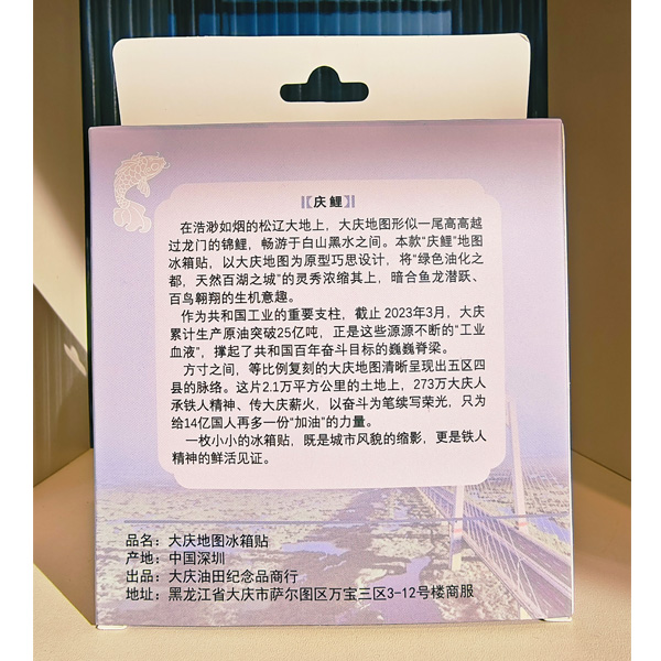 【简介】在浩渺如烟的松辽大地上,大庆地图形似一尾高高越过龙门的锦鲤,畅游于白山黑水之间。本款“庆鲤”地图冰箱贴,以大庆地图为原型巧思设计,将“绿色油化之都,天然百湖之城”的灵秀浓缩其上,暗合鱼龙潜跃、百鸟翱翔的生机意趣。
