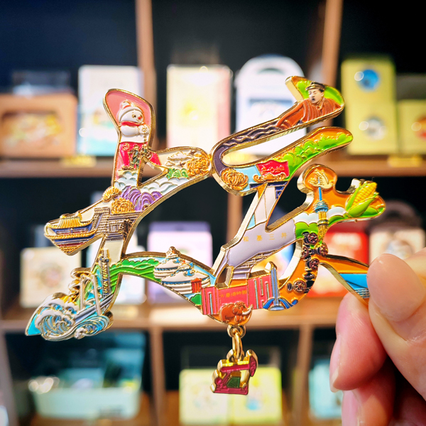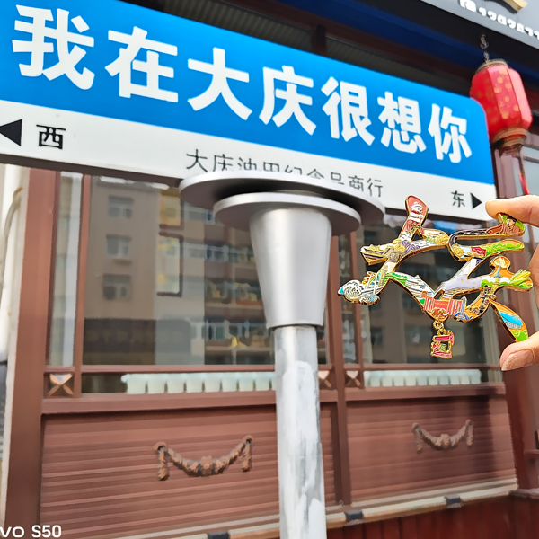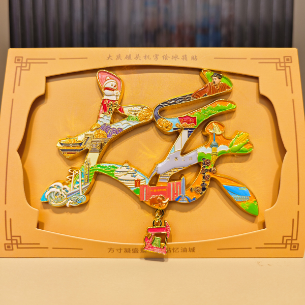 【简介】本品以金属为底,以“大庆”二字为主体造型,采用字绘浮雕工艺,将城市地标与石油文脉融于一字之间。内部精雕大庆磕头机、湿地跨线大桥、大庆博物馆、铁人纪念馆、石油之光雕塑、石油馆、冬日雪人、湿地观光塔、阿木塔旅游景区、松基三井、大庆油井等经典元素,一器尽揽油城风华。冰箱贴特设灵动吊坠,以磕头机为意象。神韵之处,在于还原大庆原油奔涌流淌的动态意境,静中有动,文藏底蕴,既是方寸之间的城市缩影,亦是镌刻初心的石油记忆,方寸凝盛景,一贴忆油城。